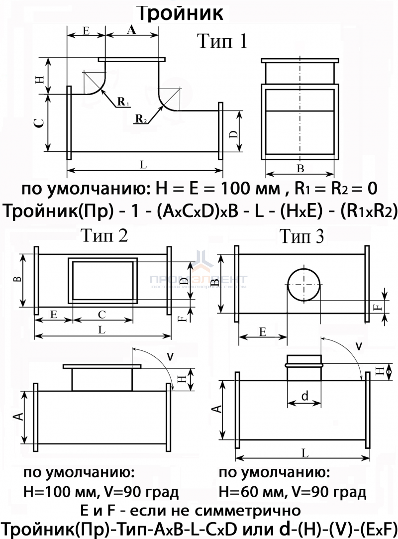 Тройник представляет собой прямой участок воздуховода и врезанной в него врезки. Тройник круглого сечения может быть с прямоугольной врезкой или с круглой врезкой. Врезка в тройнике устанавливается под углом 90 градусов, либо под углом 45 градусов.
